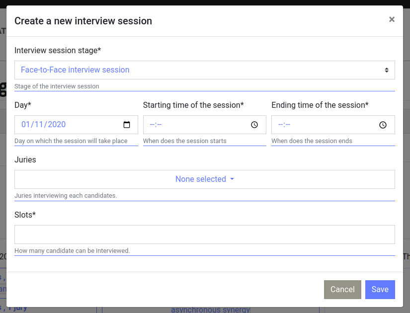 From a stage when you clicked on a big plus sign, you see this interface. Define when the session is happening, at most how many candidate can be interviewed, and the juries. Candidate can see the juries name, but not the juror names. There can be multiple session in parallel. The application doesn’t prevent you from creating parallel session with the same jury as it can happen, so be careful about it.