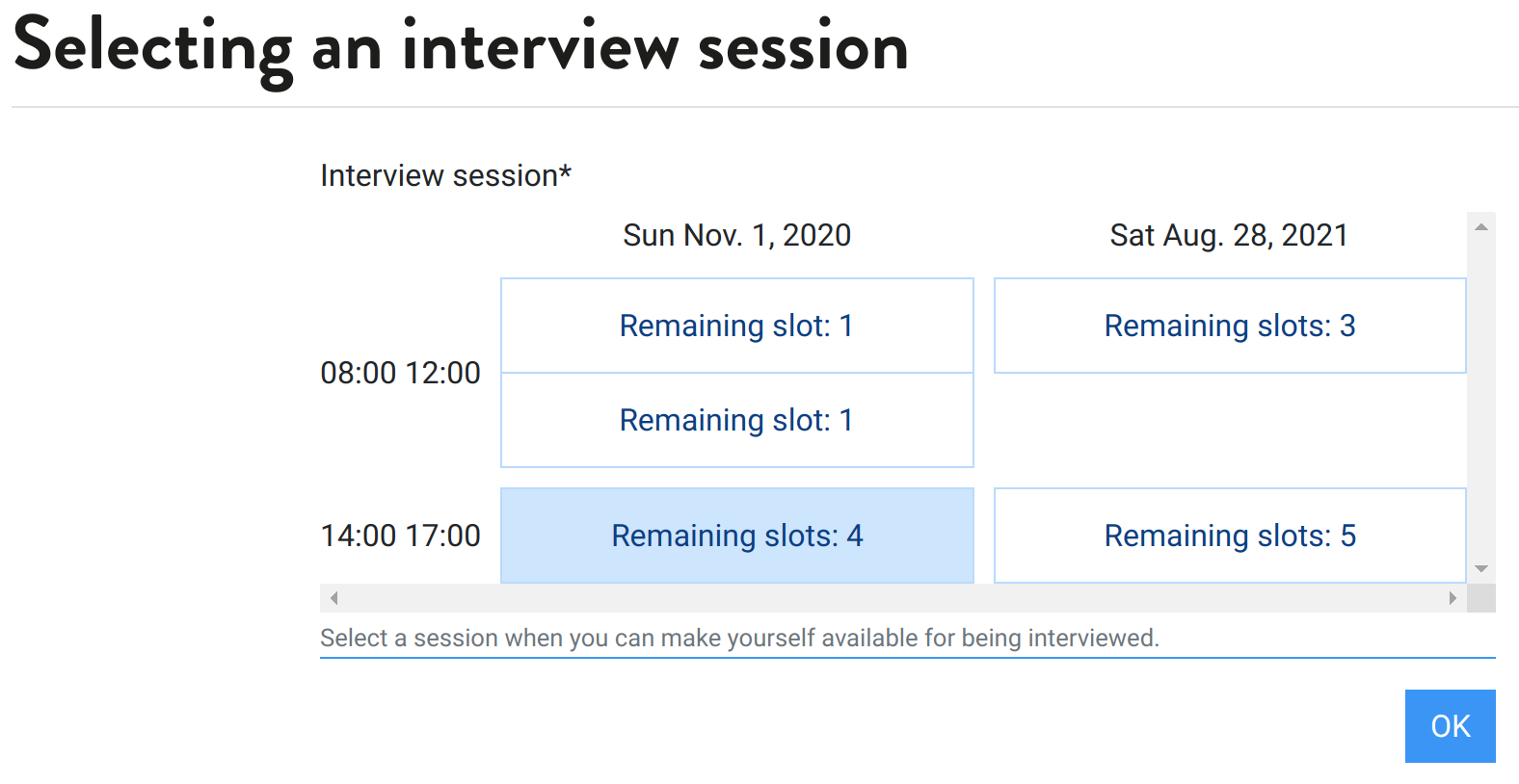 Hereafter is what a candidate will see when picking a slot in a session.