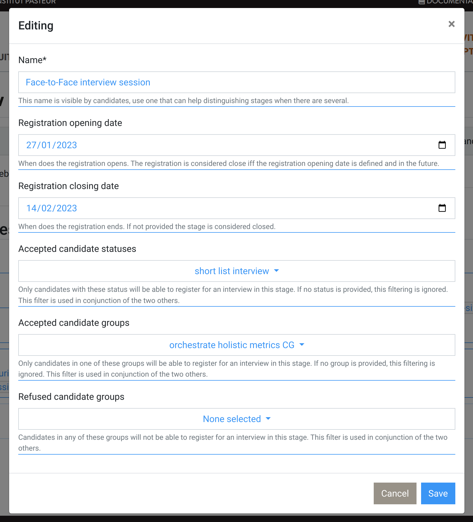 An interview session stage define a period during which a set of candidates can register for one of the interviews session. The set of candidate is based on statuses, and candidates groups. Note that a candidate can have only one interview per stage.