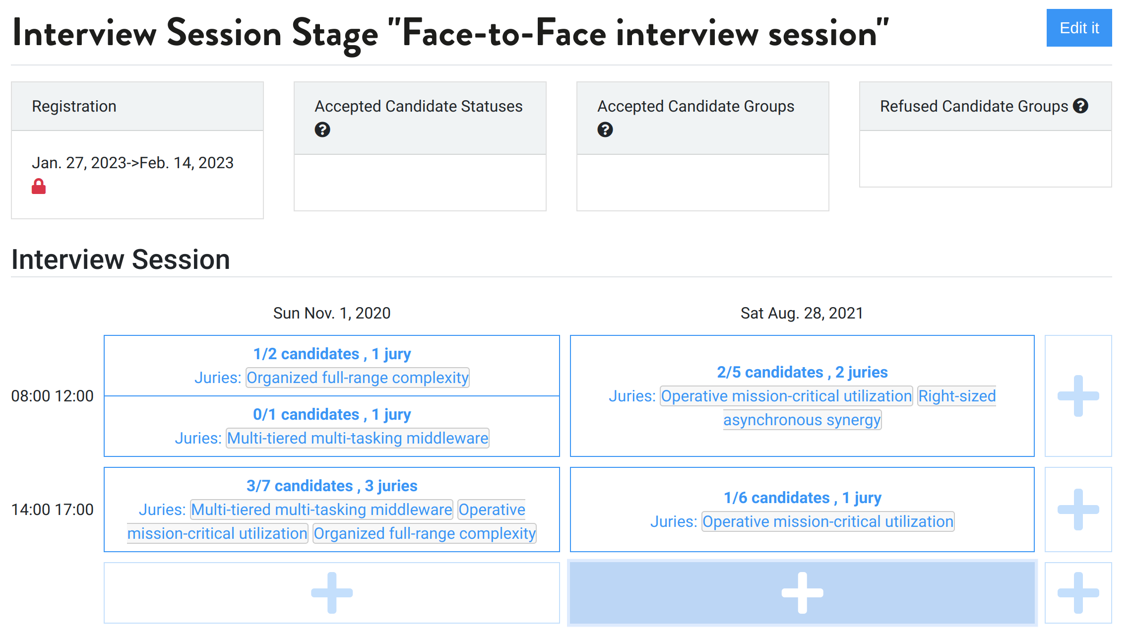 One the stage is created, you can open it and have an overview of the registration date, and how the subset of candidate that can self-register for a session is defined. You can easily add new interview session by clicking on the big plus sign.