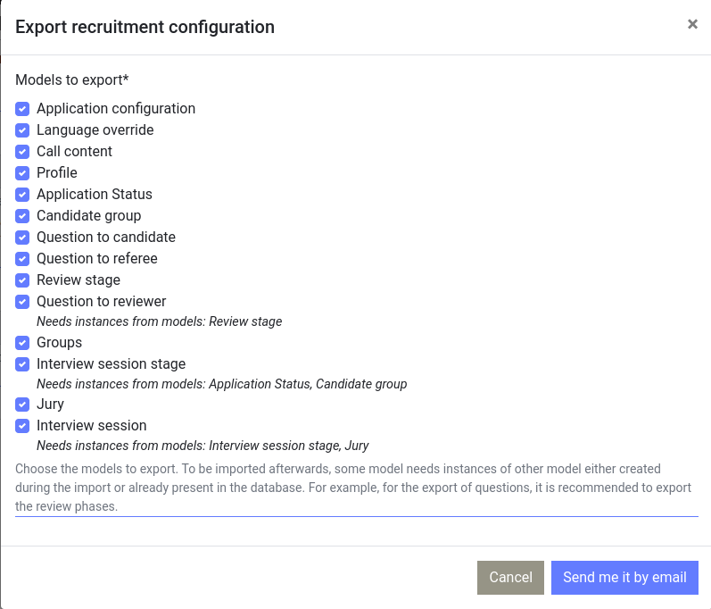 Before shutting down the instance, it is useful to keep a backup of the configuration of the instance. It includes questions to candidates reviewers and referee, profiles, candidates status, language override … It can contains all information that are not related to individuals. This backup can later be imported in a new instance.