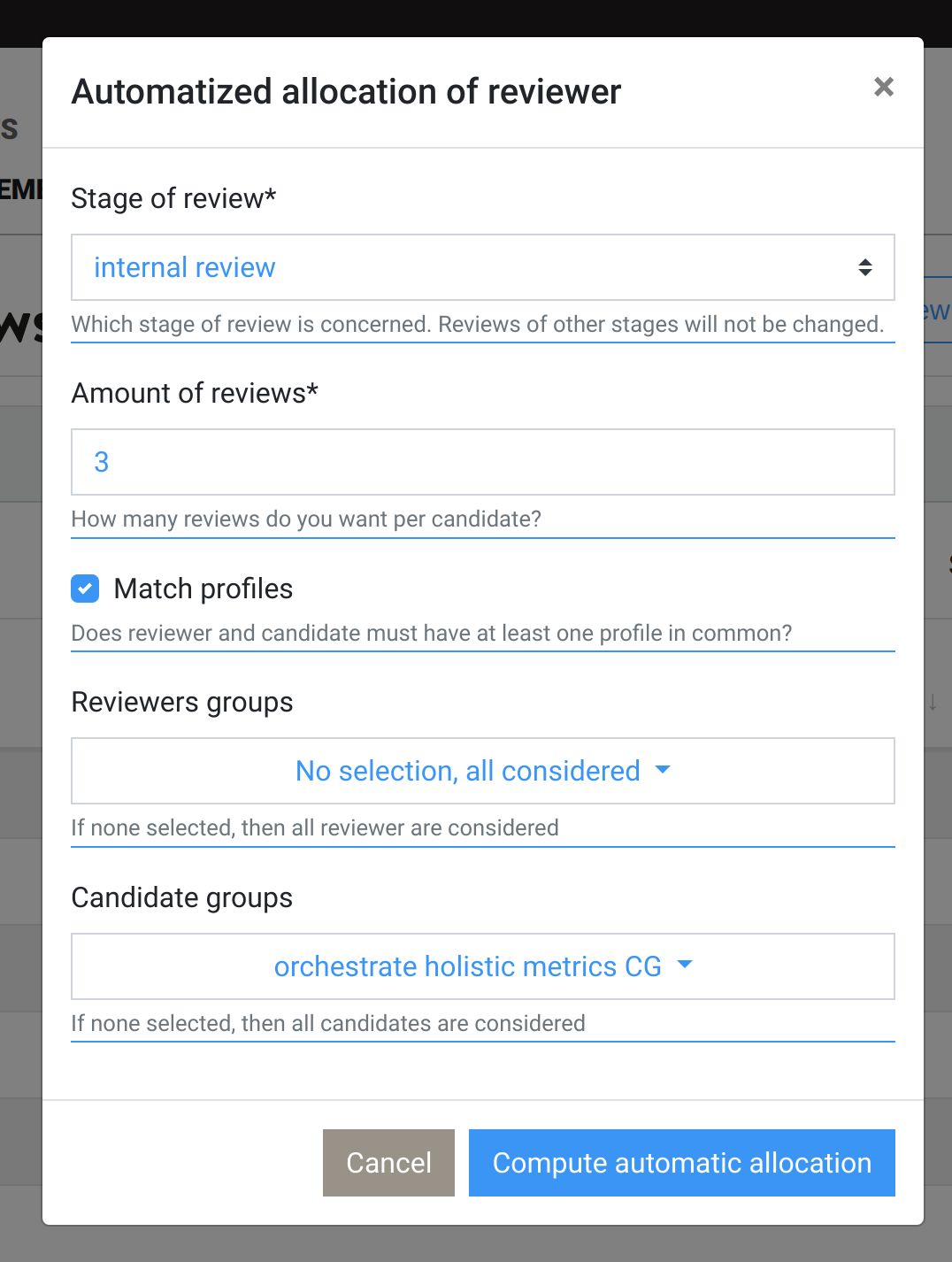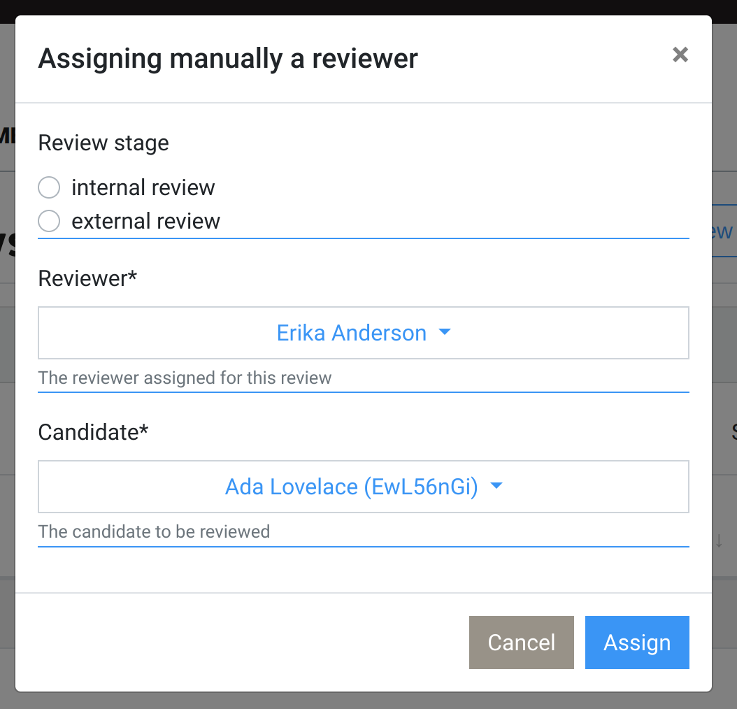 Assigning a candidate to a reviewer is only possible if they have at least one profile in common (can be bypass).