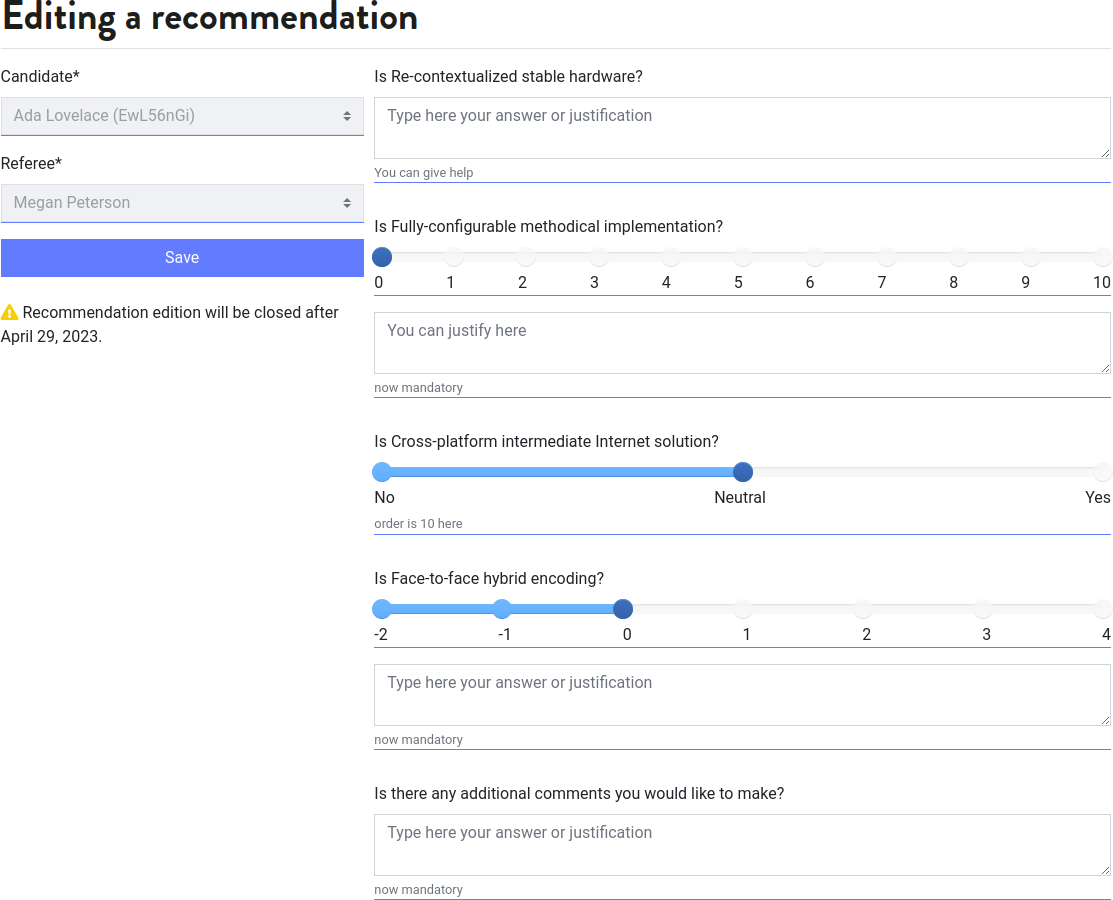 Hereafter is an example of the recommendation form. It contains the candidate name, and the closing date for providing a recommendation.