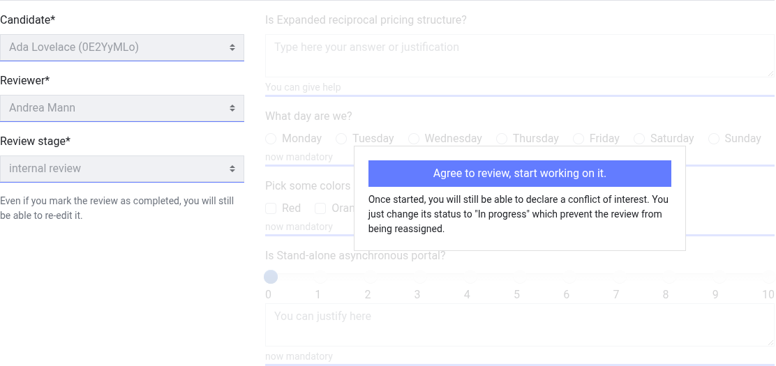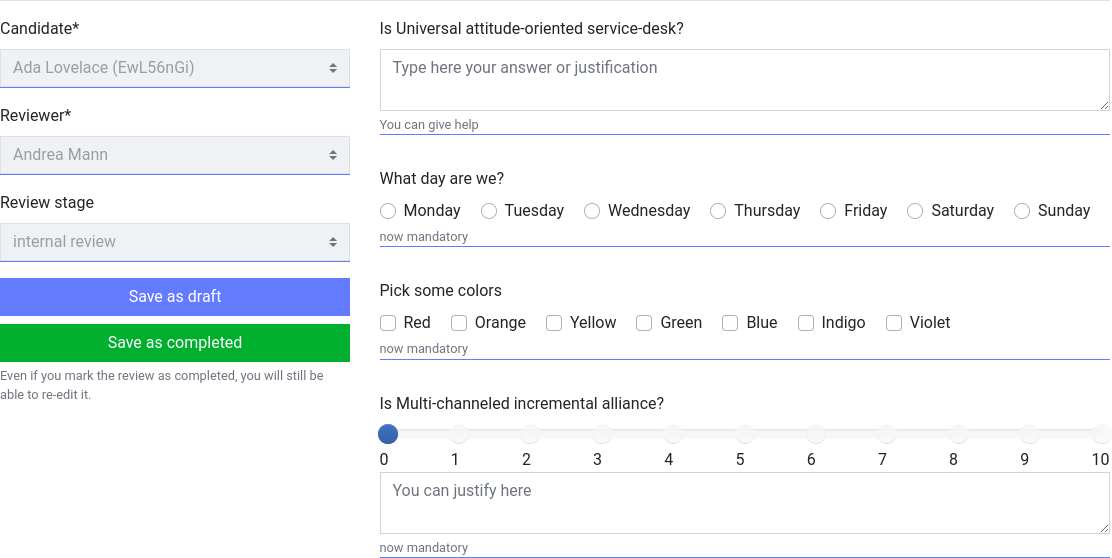 On the left part of the review edition interface, you have a reminder of the candidate name. You can save your review as a draft, but you can also mark it as completed. Note that even completed review can be re-edited later, the purpose is to help distinguishing reviews that are achieved from the other.