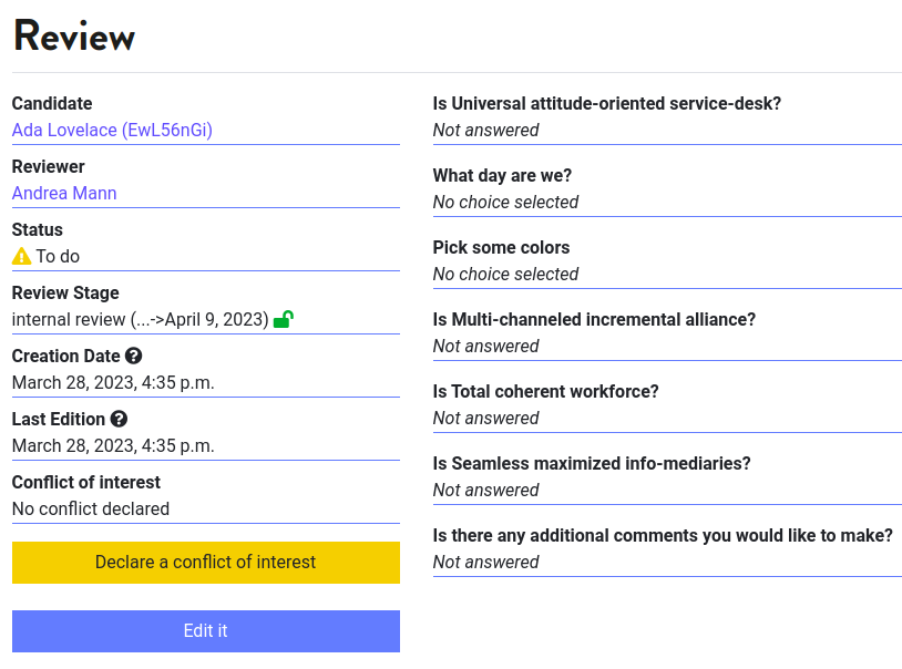 If you are granted to see the candidate, it is recommended to check fo each candidate if you have a conflict of interest. Definition can vary depending of the review process, but a good start it to consider that there is a conflict of interest if you think you cannot objectively review a candidate. In some use case it can also be that you know the candidate, or even worked with. Please see the person in charge of the recruitment to know what is a conflict of interest.