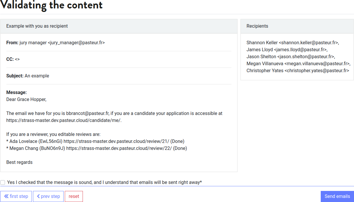 In this final step, an example email is computed based on your user. CC are listed on the left. Recipients are all listed on the right. There is only one option available: “Yes I checked that the message is sound, and I understand that emails will be sent right away”. Clicking on Send emails will indeed send the mails to all recipients.