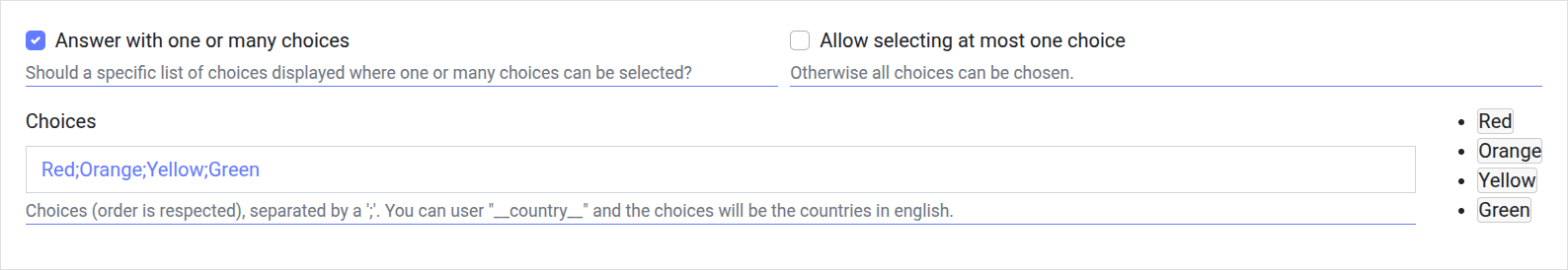 You can ask the user to pick one or many answers from a list. Text choices are provided separated by a semi-colon. When typing the choices, they are presented on the right of the field.