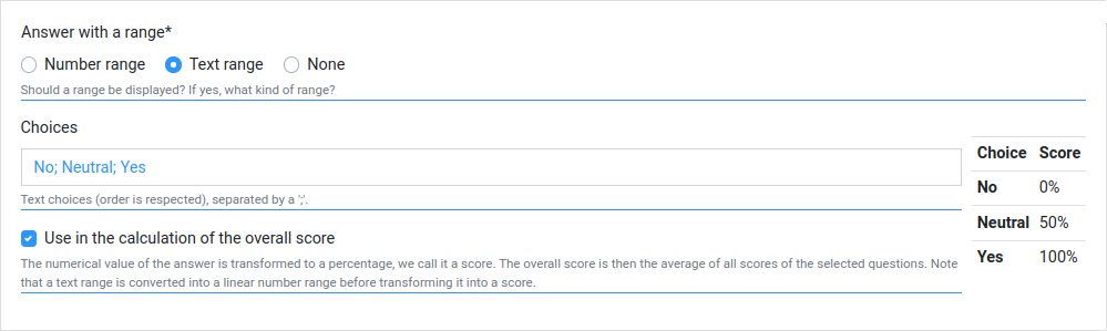 Whether it is numerical of text range, the answer can be used in the overall score (cf Security considerations and features). When it is a text range, choices are converted in percentage from 0% to 100% such as in the example here above.
