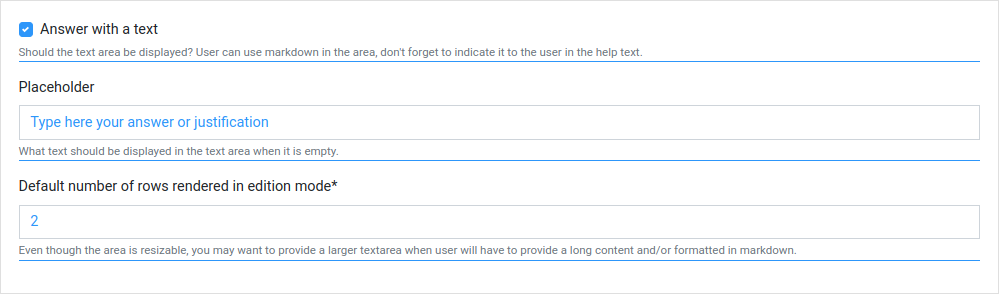 Ask the user to provide a textual answer. Can be used as main answer, or justification of a range/choice answer